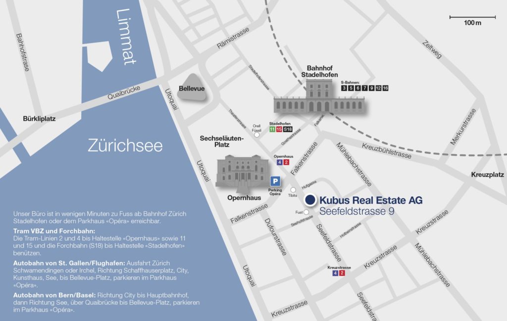 Unsere Büros an der Seefeldstrasse 9 sind in 2 Gehminuten ab Bahnhof Zürich Stadelhofen erreichbar.